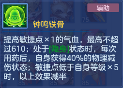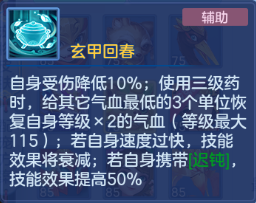 蒲牢天赋:使用药品后可吸收药品*30%的效果;自身处于隐身时,使用三级药治疗己方可令其本回合受到伤害结果降低10%。